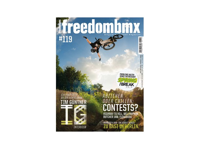 Die neue FreedomBMX "Ausgabe #119" ist im Laden! Wiedermal eine prall gefüllte Ausgabe mit lehrreichen, spannenden, lustigen und interessanten Artikeln rund um BMX. In der Titelgeschichte "Abziehen oder chillen: Contests?" widmet sich das Freedom Team der Motivation der Menschen die überall hinfahren wo es etwas zu gewinnen gibt. Im großen Interview erzählt Tim Güntner unter anderem auch seine Erfahrungen zum Thema Contests. Dies und mehr in der FreedomBMX "Ausgabe #119".