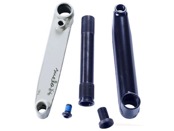 Flybies/Suelo hat es vorgemacht, die Industrie zieht nach! Die Achse besitzt einen Flansch und einen größeren Aussendurchmesser auf einer Seite. Damit kann eine Schraube eingespart werden und die Achse auf einen größeren Innendurchmesser gefräst werden, was sich widerum am Gewicht bemerkbar macht! Die geschweissten Platten auf den Kurbelarmen verbessern zudem die axiale Steifigkeit.