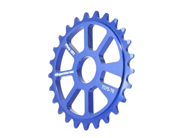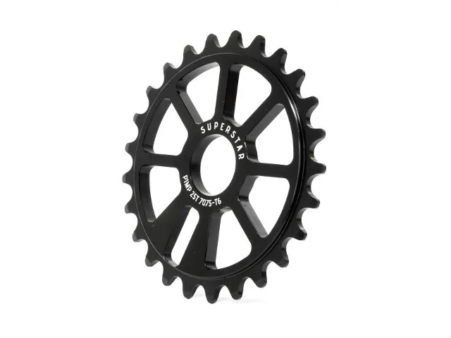 Mit dem Superstar "Pimp" Kettenblatt wirst Du auf jeden Fall zum Pimp. Es ist via einer CNC Fräse aus dem feinsten 7075 Aluminium gefertigt und deshalb so leicht. Da auf größere Kettenblätter auch größere Kräfte wirken steigt die Dicke beim Superstar "Pimp" Kettenblatt auch mit der Größe. You can go pimp around with the Superstar "Pimp" Sprocket for shure. It got CNC'd out of only the finest 7075 alloy and this explains its low weight. The bigger a sprocket gets the higher do the tensions become and this is why the Superstar "Pimp" Sprocket is thicker when it has more teeth.