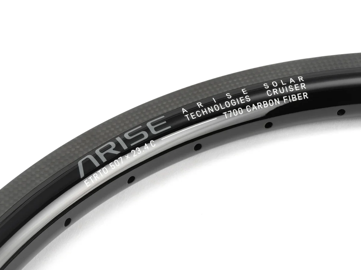 Diese Arise "Solar Cruiser Rear" BMX Race Felge - 24 Zoll hergestellt aus erstklassigem T700 Torayca Carbon bietet durch ihre Monocoque-Bauweise maximale Steifigkeit bei einem ultraleichten Gewicht von nur 440g. Sie ist Tubeless-Ready und verfügt über eine speziell strukturierte Flanke für überragende Bremsleistung. Die maximal empfohlene Speichenspannung beträgt 145 kgf.
