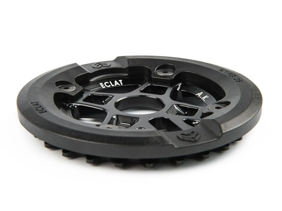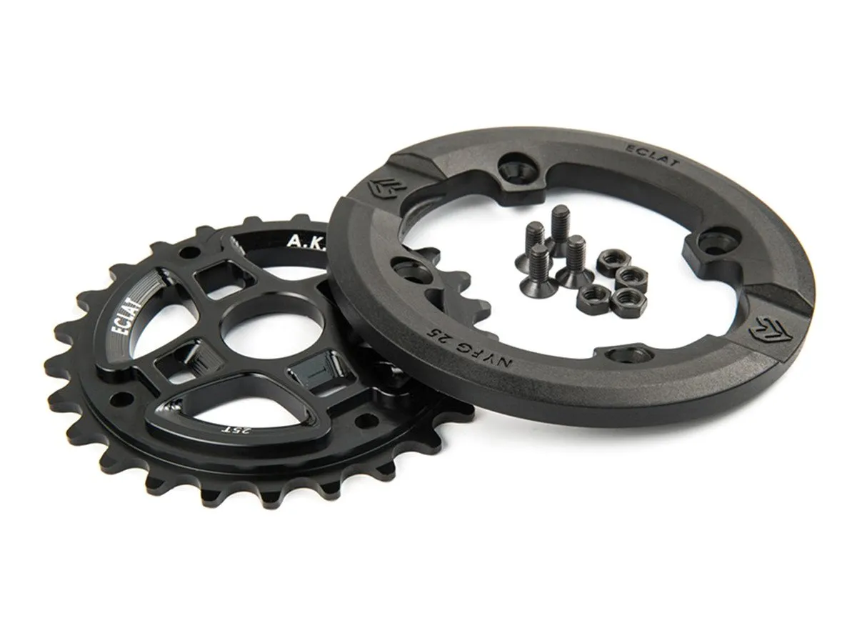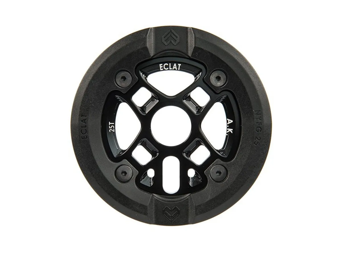 Das eclat "AK Guard" Kettenblatt ist das Signature Kettenblatt von Alex Kennedy und kommt mit einem Kettenblattschutz welcher aus Kunststoff besteht. Du kannst dieses eclat "AK Guard" Kettenblatt mit 19mm, 22mm und 24mm Kurbelachsen fahren und sofern sich der Kettenblattschutz abgenutzt hat, kannst Du diesen austauschen.