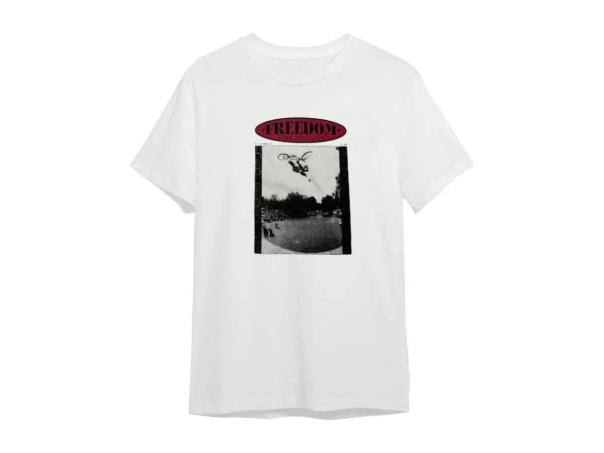 Das FreedomBMX "Cover" T-Shirt - White besteht aus 100% Baumwolle, kommt mit einem modernen Schnitt und wurde vorne mit einem Freedombmx Cover Print der ersten Freedombmx Magazin Ausgabe bedruckt.