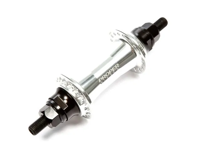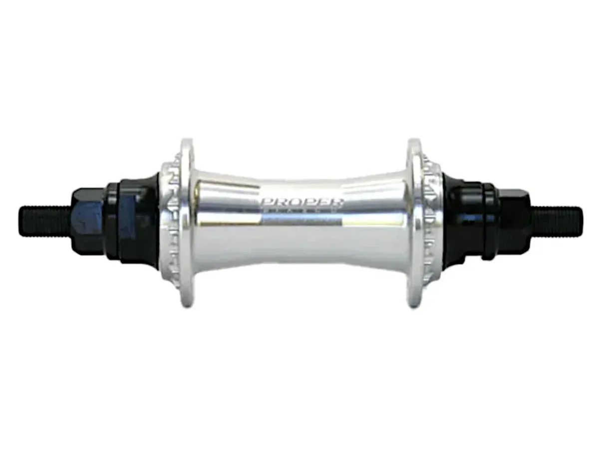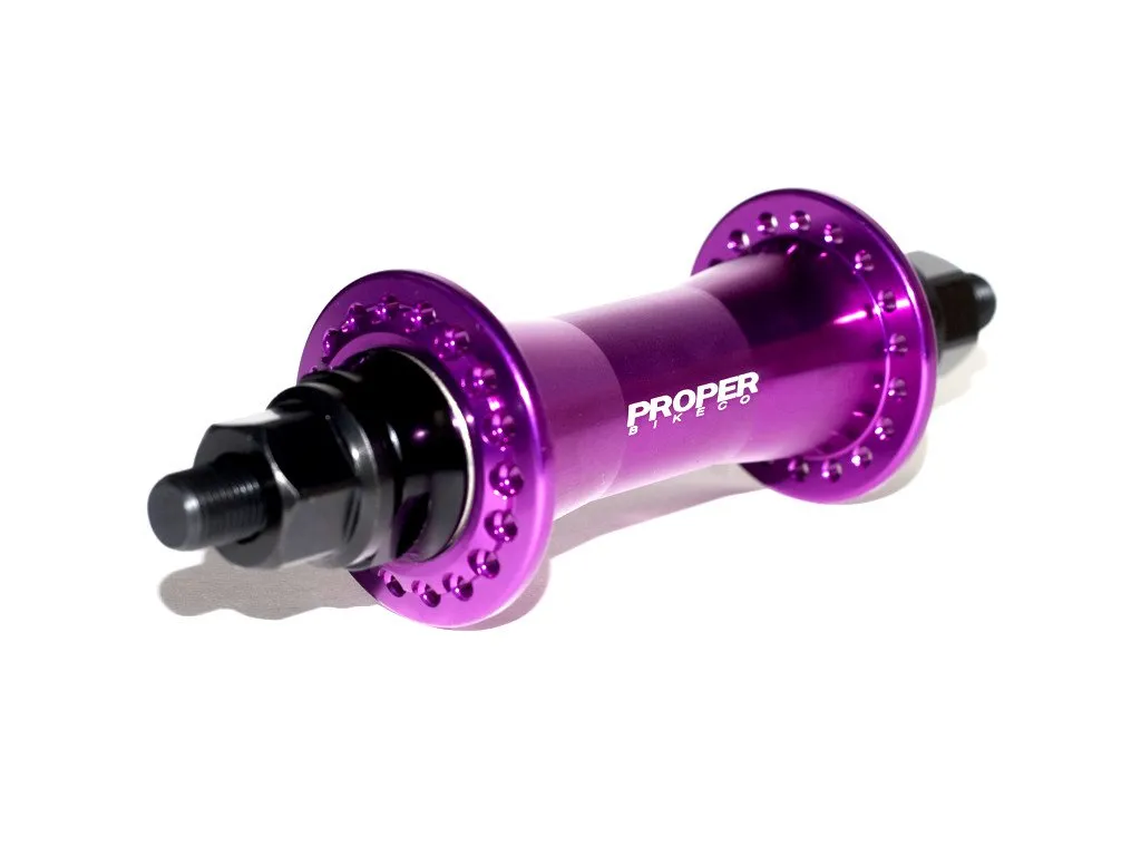Die Proper "Male" Vorderradnabe ist eine solide Vordernabe mit einer CrMo-Achse. Das Gehäuse der Proper "Male" Vorderradnabe wurde CNC-bearbeitet und verfügt über einen Laserdruck mit Proper Bikes Logo.