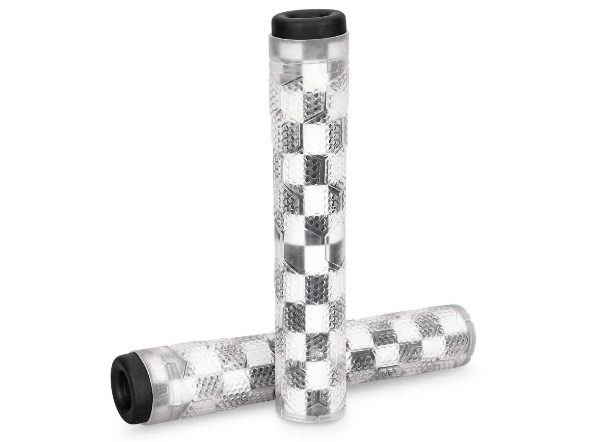 Die Stolen BMX "Hive SuperStick Checker" Griffe - Ohne Flansch kommen mit einer Länge von 165mm und vermitteln ein komfortables, softes, wie auch griffiges Gefühl. Die im Lieferumfang enthaltenen steckbaren Nylon Lenkerenden der Stolen BMX "Hive SuperStick Checker" Griffe - Ohne Flansch sorgen für einen sauberen Abschluß am Griffende und schützen das Ende Deines Lenkers. Die Griffe sind durchsichtig und das Schachbrett-Muster ist ein Sticker der vorbab auf den Lenker geklebt wird.