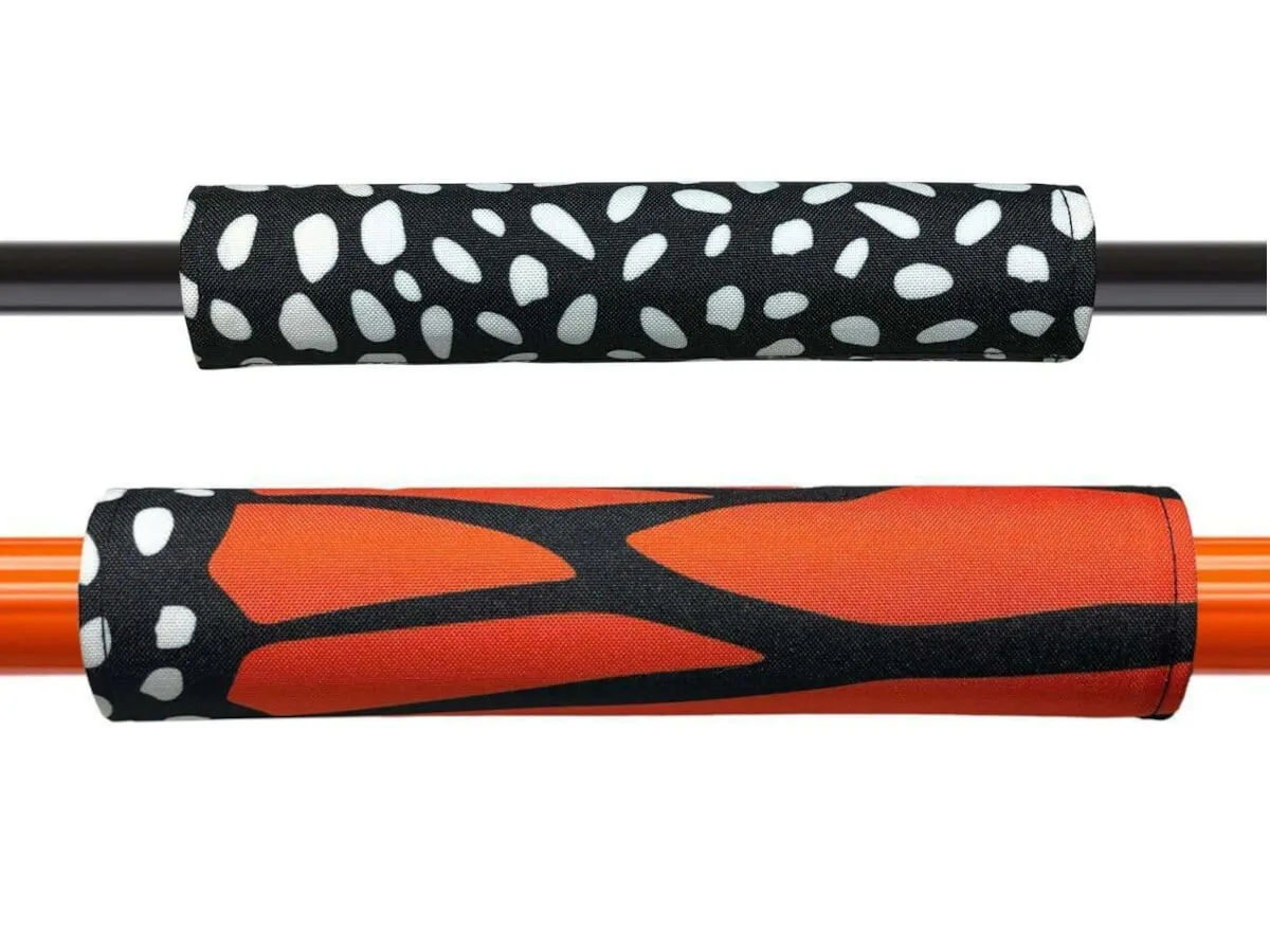 Das Sunday x Burn Slow "Monarch" BMX Polster Set ist eine limitierte Edition und beidseitig bedruckt. Burn Slow ist eine Kollaboration mit einer Bekleidungsmarke aus Austin, USA. Das Sunday x Burn Slow "Monarch" BMX Polster Set passt auf das Crossbar Deines BMX Lenkers und Deinen BMX Rahmen. Es ein Motiv eines Monarch-Schmetterlings, der für sein schönes Aussehen mit orangefarbenen Flügeln, schwarzen Adern und einem schwarz-weißen Rand bekannt ist.