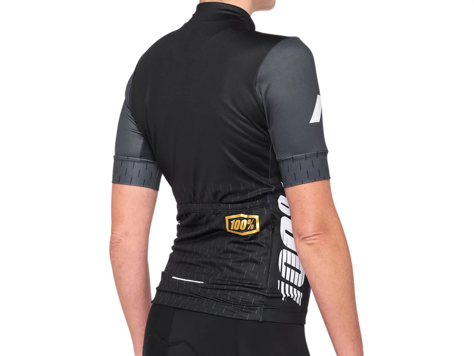 The 100 Percent "Exceeda Jersey Women" Zipp T-Shirt - Black/Charcoal is a functional garment made of moisture-regulating material with an extended back for added comfort. The 100 Percent "Exceeda Jersey Women" Zipp T-Shirt - Black/Charcoal consists of a breathable and moisture-wicking mesh fabric, features a full-length zipper, 5cm wide cuffs on the sleeves, and a large multi-compartment back pocket with an elastic closure to store your belongings.