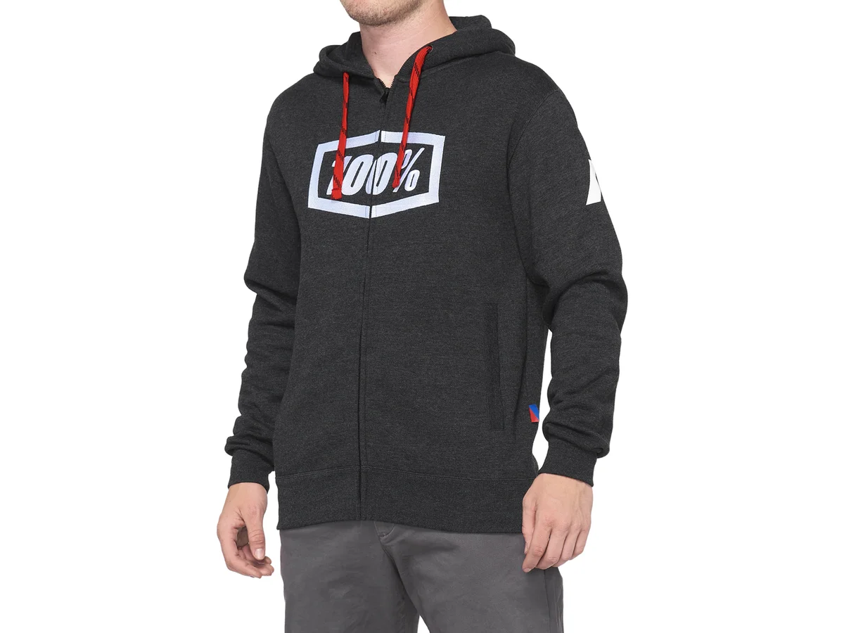 The 100 Percent "Syndicate" Zipper - Heather Black is made from a cotton-polyester blend and features a classic zipper and a hood. The 100 Percent "Syndicate" Zipper - Heather Black has ribbed cuffs, a drawstring hood, and hidden side pockets.