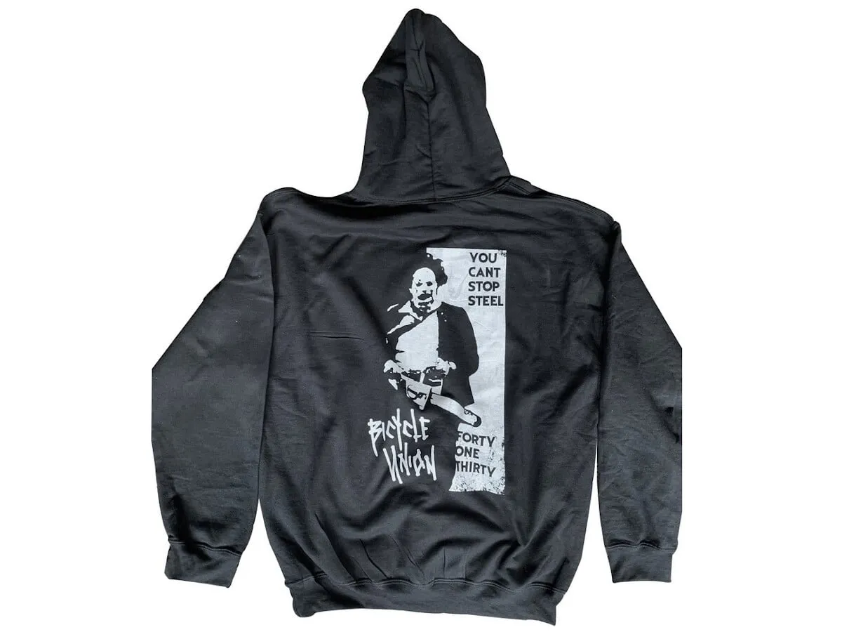 The Bicycle Union "4130" Hooded Pullover - Black is made of 50% Cotton, 50% Polyester and is printed with a Bicycle Union design on the front and the back.