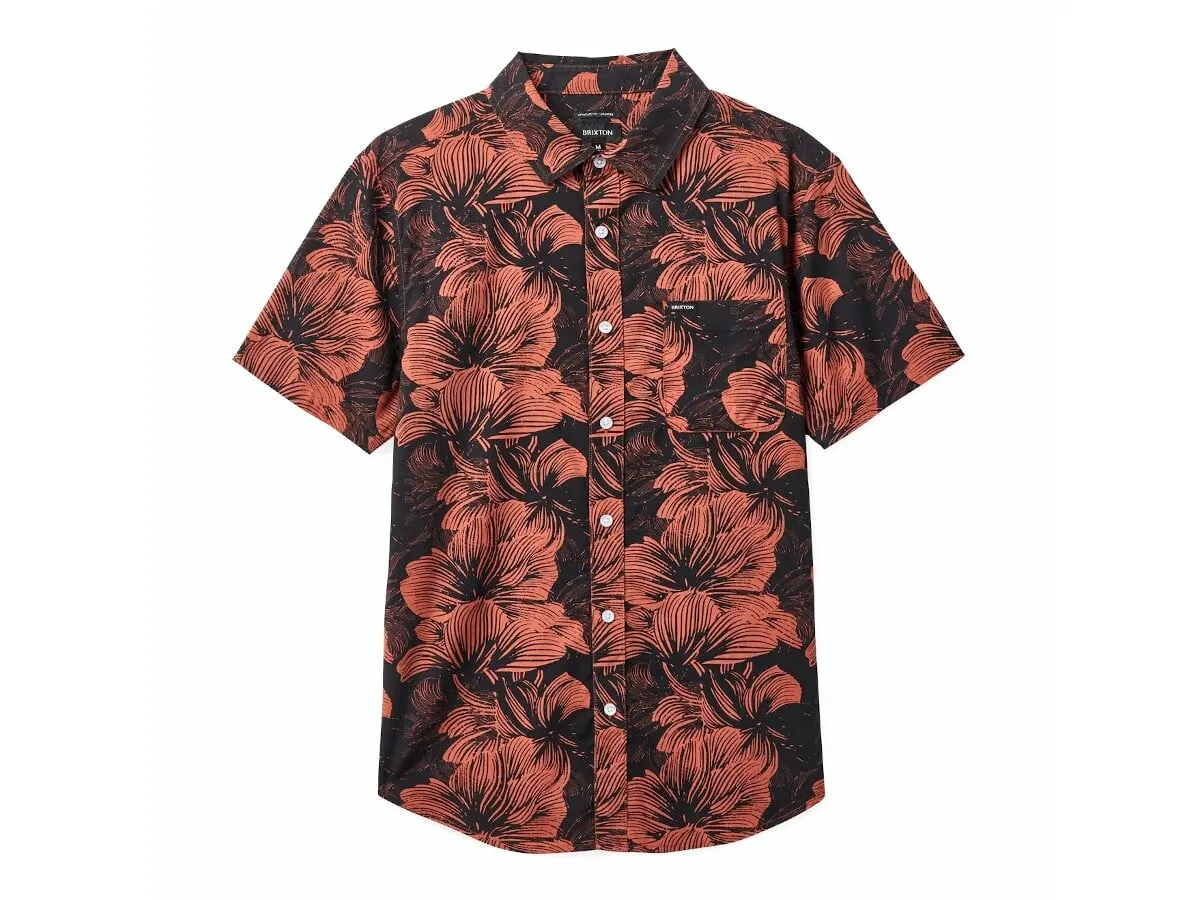 The Brixton "Charter Print" Shirt - Washed Black/Terracotta Floral is a collared shirt for understated style. Designed with custom prints in a stretch-infused plain weave, it's ready for happy hour and holidays. The breathable tri-blend has been treated with an enzyme softener wash for a unbeatable comfort from day one.