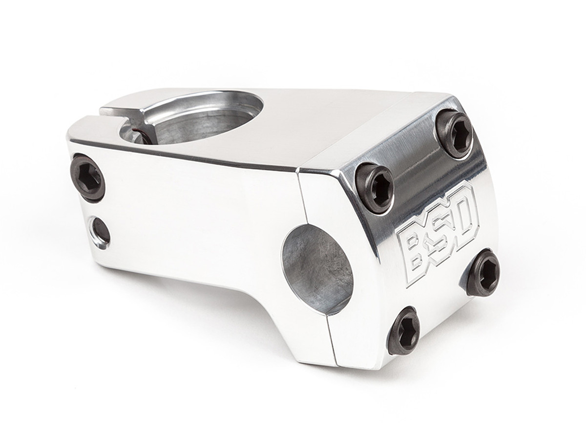 This BSD "Dropped" Frontload Stem is a low rise topload stem with a rise of 10mm, is made of CNC machined 6061-T6 aluminum and allows you a high handlebar setup. As a modern frontload stem this BSD "Dropped" Frontload Stem provides a slightly wider design to to keep state the occurring leverages of high and wide BMX handlebars. Massive allen screws and the solid and precise manufacturing quality offer you here a very high quality allround stem with 50mm reach which provides best clamping characteristics on steerer and for your handlebar.