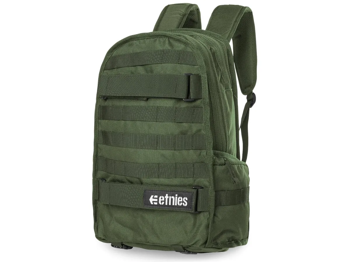 The Etnies "Marana" Backpack - Olive is a 100% polyester backpack and resistance to abrasion, tearing, and scuffs. Featuring a padded laptop compartment that fits most 15-laptops, it also includes stretch mesh water bottle pockets, ergonomic padded shoulder straps, an adjustable sternum strap.