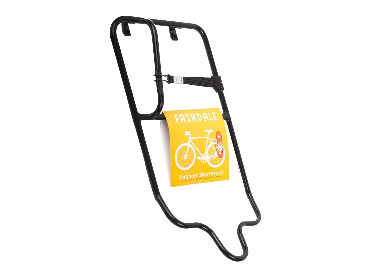 The Fairdale "Skaterack" Bike Rack is the simplest and lightest way for you to carry your skateboard on your bike. You don’t need any tools to mount it – just clamp it onto almost any bike rack and secure it with the Velcro straps. The Fairdale "Skaterack" Bike Rack is coated for long-lasting durability and comes with a bungee cord to keep your board firmly in place. It positions your skateboard behind the rear axle, giving your heel plenty of room while riding.