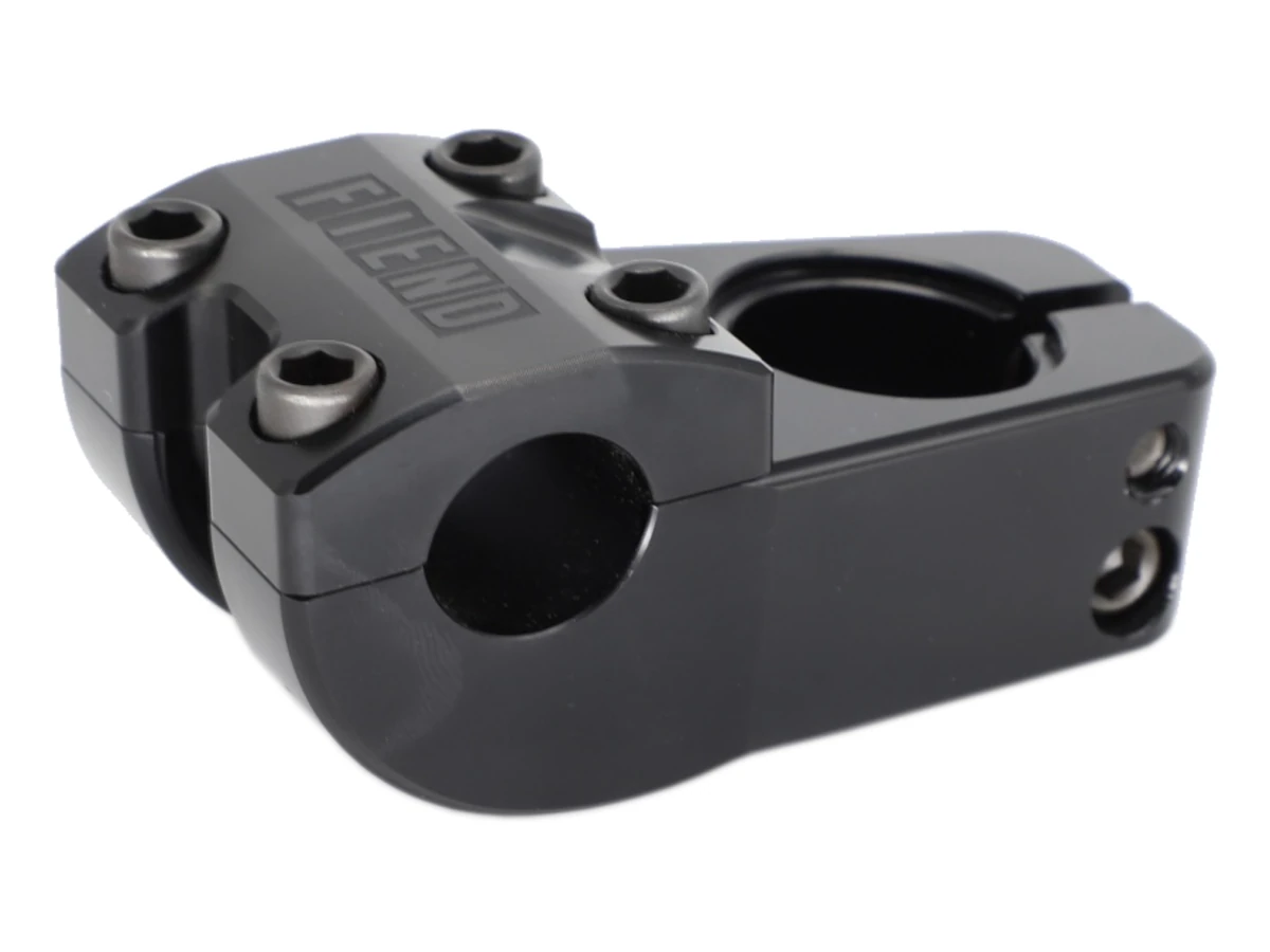 Crafted from 6061 aluminum, the Fiend BMX "Ransom" Topload Stem features a 48mm reach and a wide-body design for enhanced clamping power. It has an externally machined body and a front cap with full internal bar surface contact for a superior grip. The stem provides a 26mm rise, a recessed fork bolt area for a sleek, flush appearance, and solid chromoly bolts for maximum strength. It's finished with an etched Fiend logo.