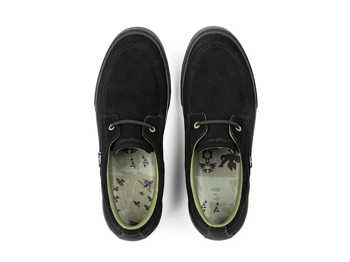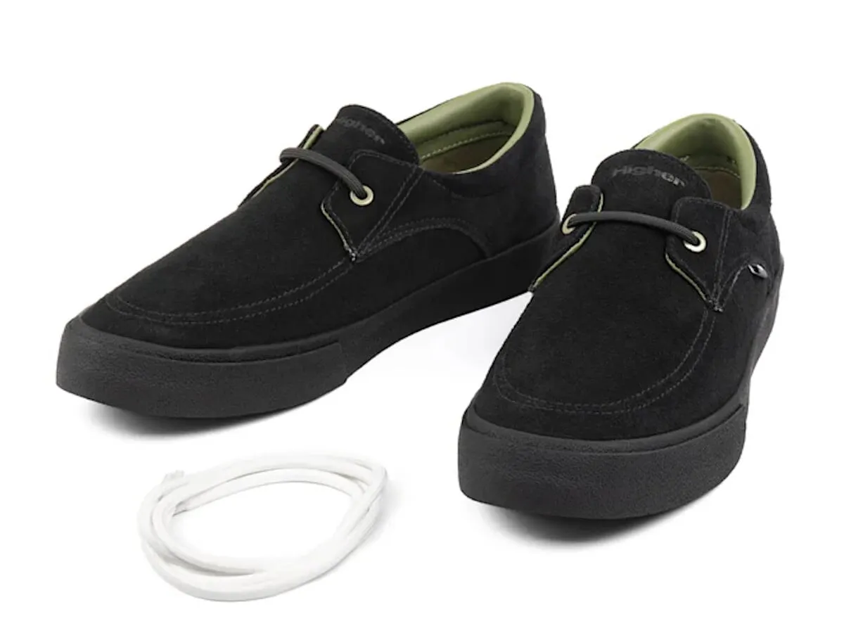 The Higher "Salem Suede" Shoes - Black/Black are single laced slip ons with a smart traditional looking silhouette and tonal branding, paired with a thick gummier vulcanised sole to help on impact and finished with a chunky round lace. The Higher "Salem Suede" Shoes - Black/Black come with all the comfort and lines of a slip on, with the added benefit of lace up support if and when needed.