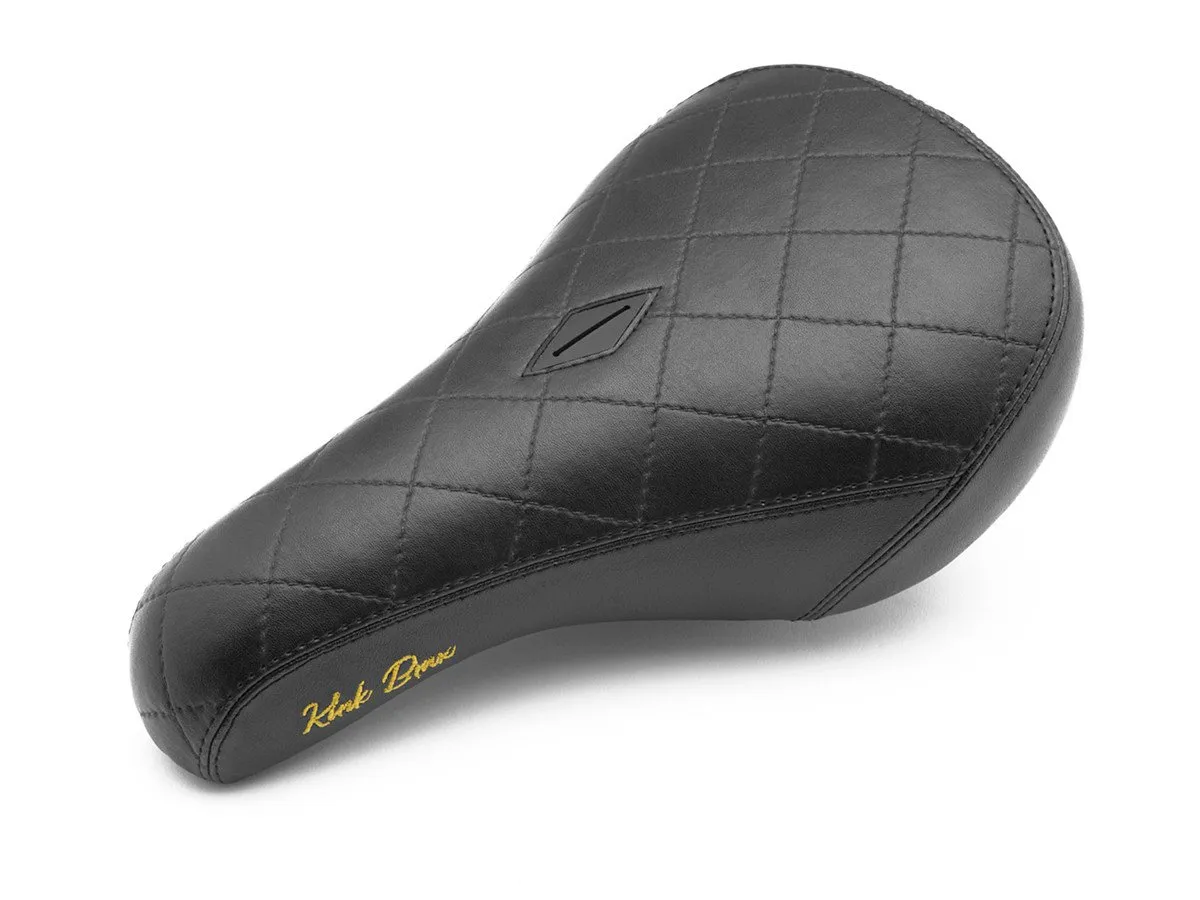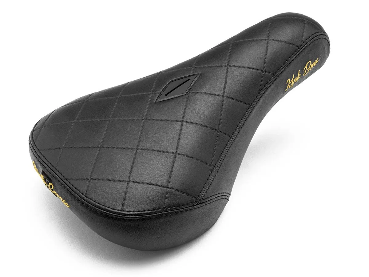 The Kink Bikes "Splendor" Pivotal Seat features a four-panel cover design and a very minimal custom diamond shaped Pivotal patch on top. The faux leather fabric is durable and features complimenting embroidered logos on the side and rear panels. The Kink Bikes "Splendor" Pivotal Seat also features extra thick foam padding and uses the traditional Pivotal system.