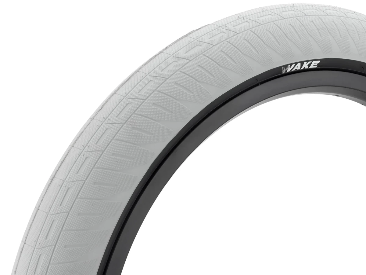The Kink Bikes "Wake" BMX Tire features a new, low-profile tread with a fully knurled surface for extra traction. The aggressive yet low-profile design makes it a versatile choice for street, park, and dirt riding. The side treads taper down to the sidewall, providing great grip when carving and improving grind clearance. At 2.45" wide, it's a beefy tire that still leaves plenty of room for frame clearance.
