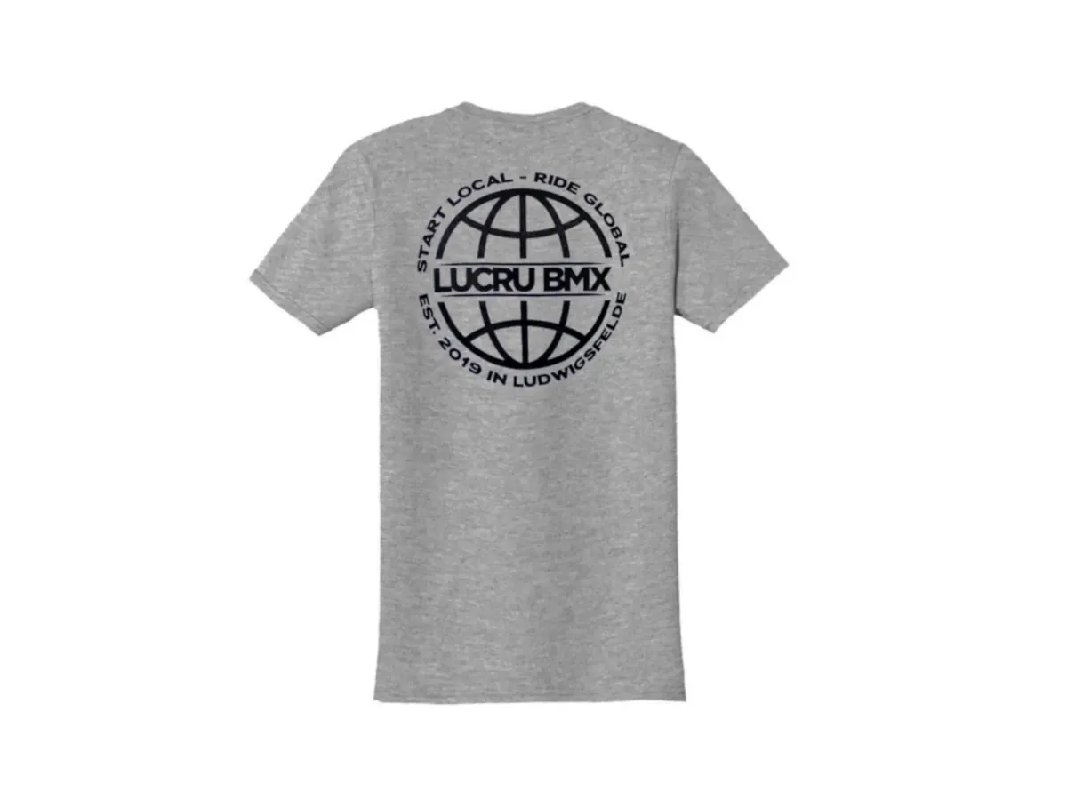 The LucruBMX "Global" T-Shirt - Heather Grey (Kids) is printed with a Lucru logo on the chest and a large Lucro ride global design print on the back. The LucruBMX "Global" T-Shirt - Heather Grey (Kids) consists of 100% cotton.