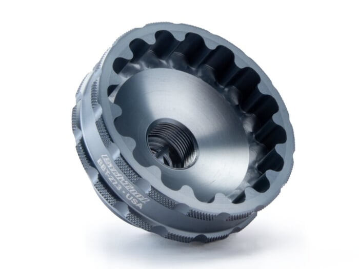 The Park Tool "BBT-27.3" Bottom Bracket Tool is a CNC machined aluminum tool for 16-groove external thread bottom brackets. Anodized for easy identification and with 3/8" socket for ratchets and torque wrenches.