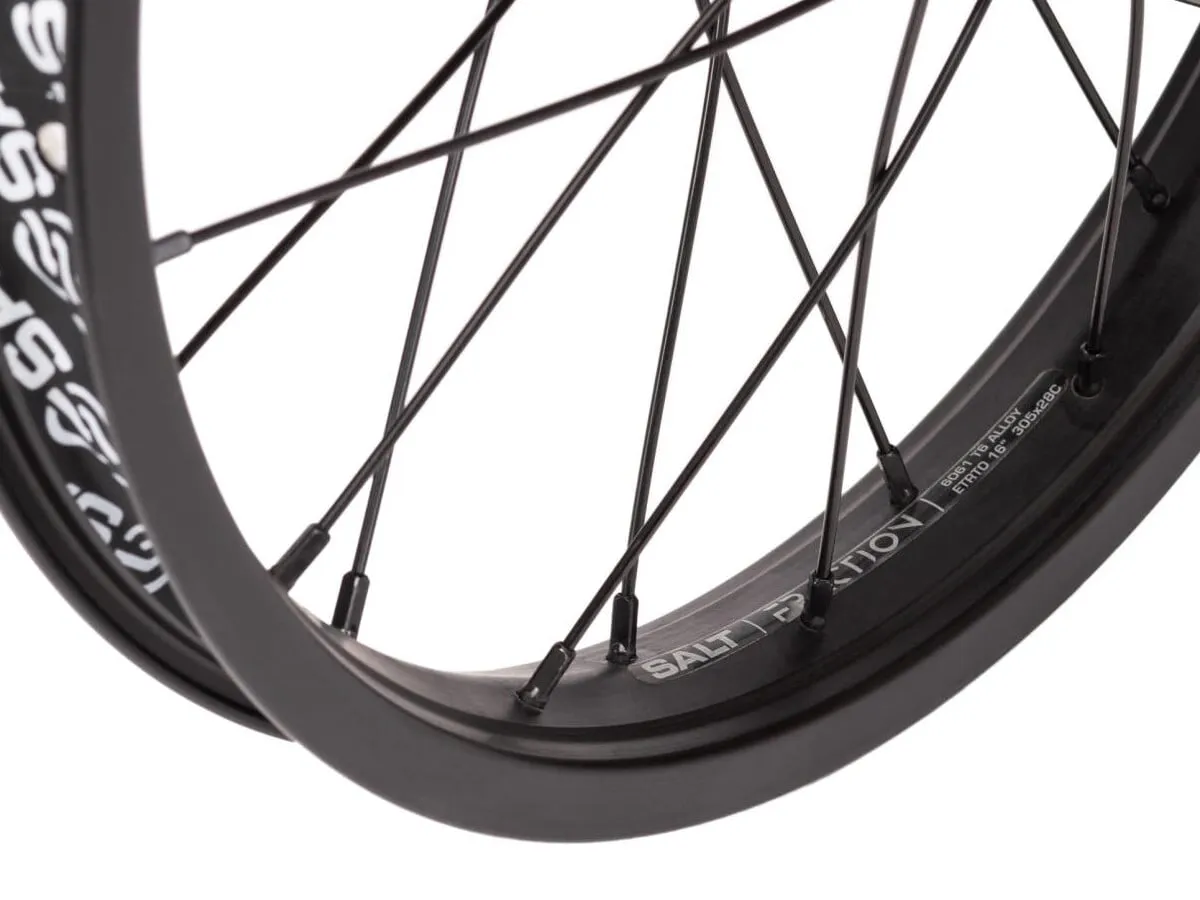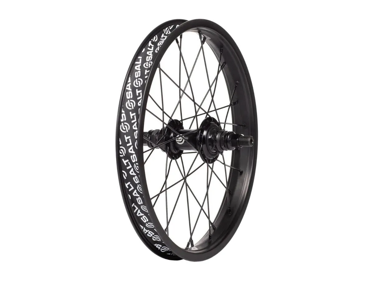 The Salt "Rookie" Cassette Rear Wheel - 14 Inch is made of the Salt "Fraction" 14 Inch rim and the Salt "Rookie" cassette hub. The Salt "Rookie" Cassette Hub has a solid 10mm CrMo Axle and a 9t RHD driver.