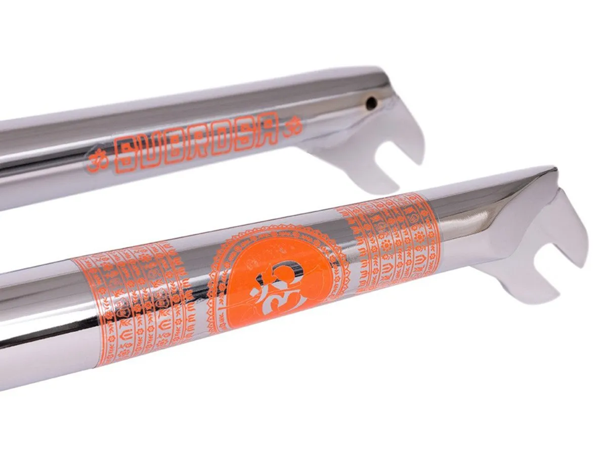 The Subrosa Bikes "OM" BMX Fork is the Signature BMX fork of Joris Coulomb, and is made for a technically BMX Street riding. The Subrosa Bikes "OM" BMX Fork has a 22mm Offset and is made by 100% post weld Deathproof heat treated 4130 CrMo and comes with a M18 aluminum topbolt.